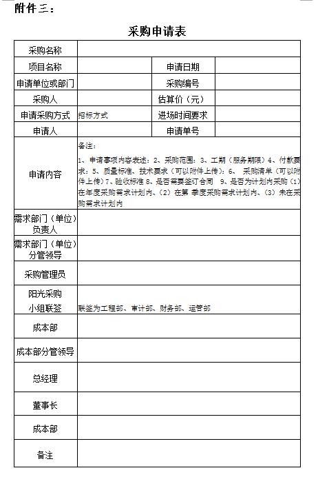 3.工作流程:需求部門(單位)提報《采購申請表》,按規定程序審批通過后,由成本部委托招標代理機構具體實施。