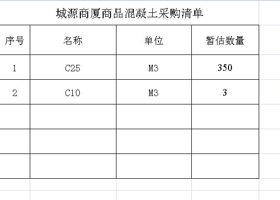 4)采購內容:城源商廈室外景觀工程商品混凝土的采購并運輸到采購人要求的指定地點,采購清單詳見附件。